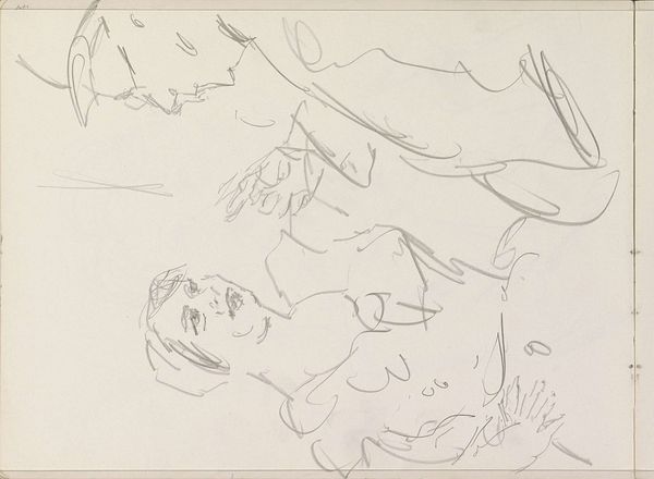 Curator: This sketch, held here at the Rijksmuseum, is by Leo Gestel. It’s called "Two Nude Women Swimming" and dates roughly between 1891 and 1941. It’s rendered in pencil on paper. What’s your first reaction? Editor: There's a real sense of dynamism and fluidity. It almost feels unfinished, capturing a moment rather than a complete picture. The lines suggest movement in the water. Curator: Gestel, of course, moved through various phases, including impressionism and even a touch of abstraction here. The ambiguity of the figures’ relationship is interesting when considered through a feminist lens. Are they joyous and liberated, or somehow struggling? Editor: The sketchiness emphasizes the materiality – the tooth of the paper, the graphite deposit, the rapid hand of the artist. I’m curious about the conditions under which Gestel made this. Was it a quick study outdoors, a preparatory drawing for something more formal? It hints at the labor involved. Curator: Precisely! It's fascinating to situate this within discussions around representation, looking at how female bodies have been depicted, the male gaze, the politics of nudity. Editor: I'm more drawn to how this connects with other works where artists use swimming as a motif – to think about the working class and leisure, public bathing and social spaces in delft, and its materials Curator: The tension between a quick impression and the enduring cultural weight of representing the female form creates a fascinating dialogue. I think Gestel captured a transient moment within a wider tradition of looking and making. Editor: For me, it’s more about the energy of the process – that making tangible the feel of the pencil, the social and environmental landscape implied within the sketch and thinking more about what labour made that production even available Curator: Agreed. There are so many avenues to explore. Editor: Definitely gives you more to think about how simple acts are tied in bigger productions