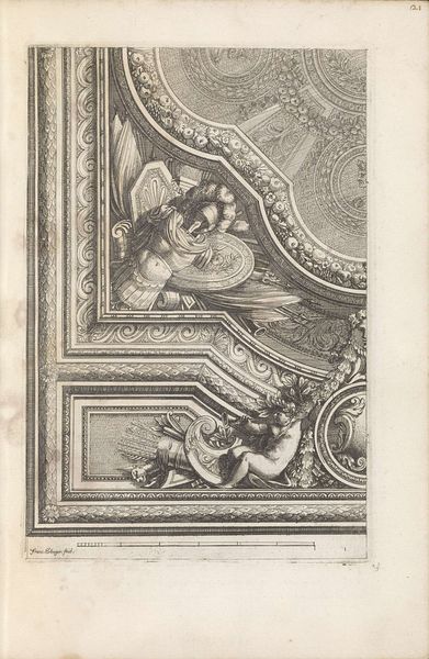 Curator: This is a print called "Twee kwarten van plafonds," which translates to "Two Quarters of Ceilings," dating somewhere between 1668 and 1716. It's currently held at the Rijksmuseum. Editor: My first thought? Dazzling! It's got this incredible sense of depth, even in just black and white. There's an undeniable richness in the texture. It looks heavy, regal even. Curator: Heaviness is a perfect word. It evokes that Baroque love of elaborate ornamentation. Observe the geometric precision contrasting with allegorical figures; there's Death, with his scythe, framed by putti—chubby cherubs, if you will—and overflowing foliage. Editor: Death and chubby cherubs— quite a combination! There is so much busyness in every corner. I'm drawn to the contrast in light. The way the figures are shaded really gives them a tangible presence, like they’re about to float right out of the frame. Is it just me, or is there a bit of humor tucked away here? Like Death is a slightly bored, albeit powerful, character surrounded by chaos. Curator: That's the Baroque spirit distilled! Look at the ornamental frames around the central scenes; the figures feel almost trapped, pressed into these rigidly defined spaces. There’s tension between exuberance and constraint. It’s about power and imposing order onto the messiness of life. Or trying to. Editor: That tension sings. It's in those details, like the little faces peering out from the corners, half-hidden in shadow. It almost feels like a sly wink amidst all the pomp. Perhaps it's a reflection on the ephemeral nature of these very ceilings; the glory of the moment caught on paper for future gazers like us. Curator: Precisely. These designs are but fleeting moments, frozen through the precision of engraving. A document to remember things change even the ceilings. Editor: I came for an exercise in historical art and instead walked away feeling death looming above me, while the weight of history gently caresses my cheek. Quite potent for a small piece. Curator: Exactly. "Twee kwarten van plafonds" might appear simple, but hides emotional, contextual layers underneath.