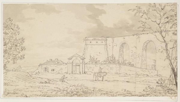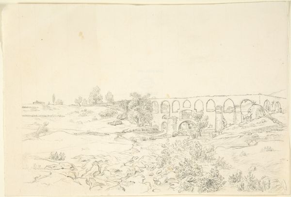 Editor: This is William Marlow's "Ponte Molle," currently held at the Tate. The pencil work is so delicate, almost ephemeral. What strikes you about the composition? Curator: The linear precision and subtle tonal variations are quite compelling. Observe how Marlow uses the arches of the bridge to create a rhythmic visual sequence. Editor: I see that, the repetition is very effective! What does that rhythm suggest to you? Curator: It evokes a sense of measured progression, perhaps mirroring the journey across the bridge itself. The bridge's form is further emphasized by the contrast of the water and land. Editor: This has given me a greater appreciation of Marlow's formal choices. Curator: Indeed, examining these elements allows us to understand his artistic intent more fully.
