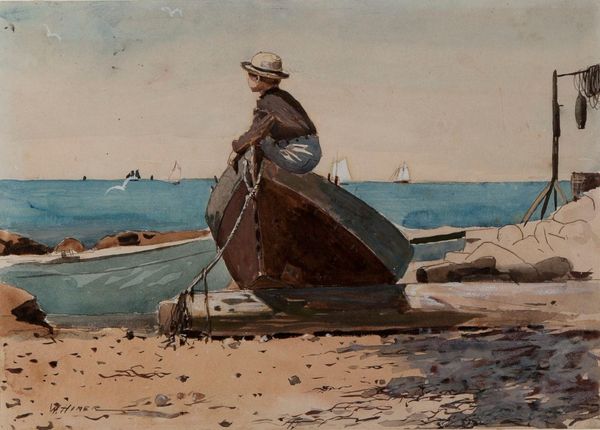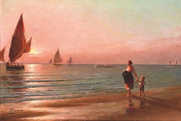 Curator: Here we have “Marina Al Tramonto,” an oil painting by Pasquale Celommi that really pulls you into a serene seaside moment. What's your initial take? Editor: Hmm, muted melancholy. That pale orange light blanketing everything gives it an end-of-day weariness. And all those earthy tones, almost monochromatic, like fading memories. Curator: Exactly! The realism here really anchors those fleeting moments. Notice how the light catches the water's edge. It's like the scene is breathing. It does bring up a certain mood of introspection, doesn’t it? Editor: Definitely, but consider the composition itself. That horizon line so high up creates this flattened pictorial space. See the figures—they are pushed right to the bottom edge, almost as if suppressed. And the anchor off to the side only intensifies a sense of foreboding. Curator: But don’t you think Celommi is also capturing a specific Italian fishing community here? These elements are both practical, reflecting the daily grind of maritime life and aesthetically purposed. Editor: Undoubtedly, we also appreciate the way Celommi is evoking atmosphere with brushwork here. I notice a semiotic code too where the boats in the distance signify hope. Though barely noticeable. Curator: Right, the light definitely carries an air of mystery, doesn't it? It's not just documentation. There's also this emotional undertow in the mundane reality being presented here. It gives you something to latch onto beyond the surface beauty. Editor: And perhaps we shouldn’t discount how those tangled ropes on the beach draw your eye from front to back—it's this masterful handling of perspective and texture. Curator: Ultimately, it speaks to the complexity beneath apparent simplicity—right? Editor: Perfectly capturing a unique view with a deceptively quiet narrative.