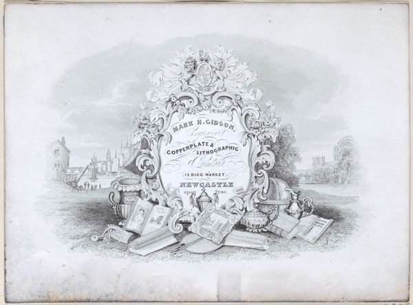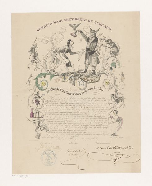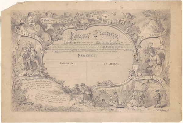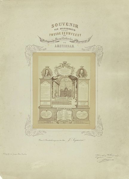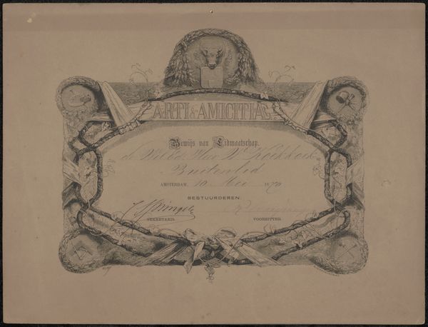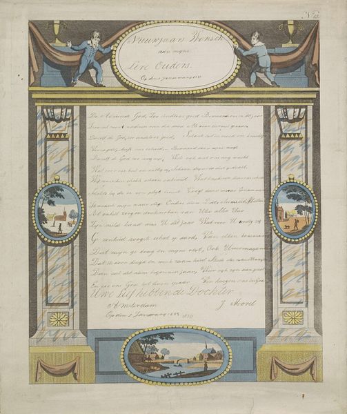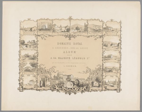 Curator: I’m immediately struck by how intimate this print feels, almost like a handmade valentine, despite its elaborate design. What’s your take? Editor: I think you’ve nailed it—there's a tender formality here. This is "Herinneringsprent opgedragen door Jan Pieter Heije aan de in- en opgezetenen te Abbenes," or “Commemorative Print Dedicated by Jan Pieter Heije to the Residents of Abbenes." Dating back to 1875, it's a print featuring intricate engraving, created by J. Postma. It blends landscape scenes with a textual inscription, almost like an illuminated manuscript. Curator: Yes, illuminated! It has this beautiful layering of image and text, framed by such delicate ornamental borders... Do you notice how the rural scenes are so evocative? A lone shepherdess, serene canals... they create this romanticized vision of the Dutch countryside. The almost cursive text within the cartouche really sets this tone, too. It gives a special look and feel like this was specially commissioned as a personalized print just for Abbenes's citizens. Editor: Absolutely. That idealized landscape taps directly into cultural memory. Each of these images is loaded, from the church spires denoting community and faith to the canals representing Dutch ingenuity. The central text, no doubt, reinforced shared values and local pride. And the dates… November 1813 and 1859. They're clearly not arbitrary; these commemorate special occasions that had an impact in that municipality, strengthening that link. The sheep reminds us that we used animals for their materials, clothing the inhabitants, and were critical to local prosperity at this time. Curator: A romanticization of place, culture, and time... A yearning for an idyllic community. And maybe, beneath that sweetness, a longing for simpler times, rendered as civic devotion! I would bet this gift would not be what it is now if you tried gifting this exact replica these days! It definitely encapsulates more than just art. Editor: Indeed, the weight of symbols tells us something profoundly beautiful about what we valued enough to hold sacred then. This is an early piece of what would be the origin story of the place they call home, if it weren't already present to those residents. Curator: I completely concur; this delicate engraving reminds me of both the art and artistry, the time that this piece surely took the engraver, and is also reminiscent of those memories. A tender and intimate moment shared. Editor: And shared once again through this journey of symbols and meaning.