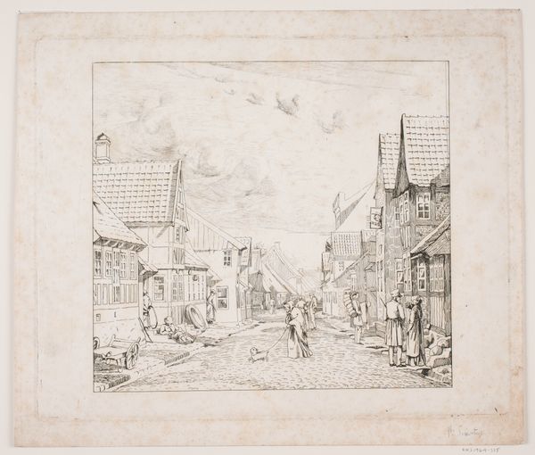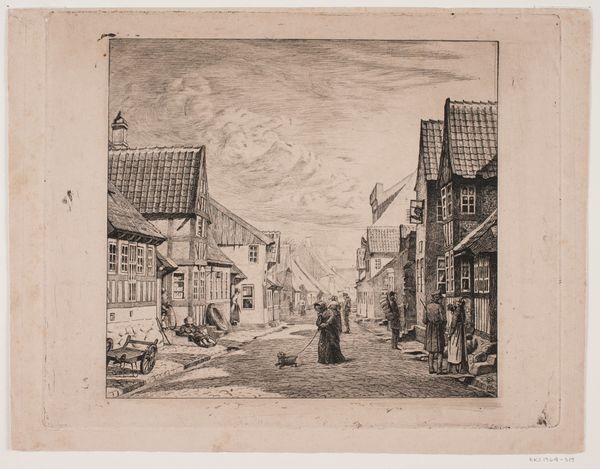 Editor: This is Herman Armour Webster’s "Place Nationale, Pont de l'Arche," an etching held at the Harvard Art Museums. The sepia tones give it a very nostalgic feel. What can you tell me about the composition? Curator: Note how Webster uses the contrast of light and shadow to define the architectural forms. The density of line suggests a deliberate investigation into tonal variation. How does this technique affect your reading of the space? Editor: It almost flattens it, making it feel more like a stage set than a bustling marketplace. Curator: Precisely. Observe how the artist manipulates perspective and scale, creating a compressed and theatrical space. The subject becomes less a depiction of reality and more an arrangement of forms. Editor: That's a fascinating way to look at it. I hadn’t considered it that way. Curator: By focusing on the formal relationships, we can appreciate the artist’s conscious manipulation of visual elements.