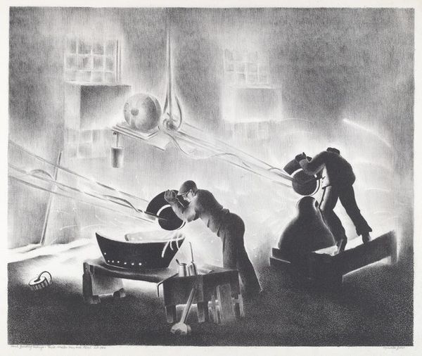 Editor: This is Bernard Joseph Steffen's "Windy Day," a lithograph from sometime between 1935 and 1943. I'm really struck by how the artist uses contrasting textures to convey movement. It almost feels like the wind is physically pushing these figures around. What stands out to you? Curator: Precisely. The dynamism inherent in the subject matter is deftly translated into formal elements. Observe the density of the linework, particularly in the lower half and near the group of pedestrians; the closely packed strokes imply the force of the wind, almost a tactile representation of resistance. What does this contrast, specifically between textures, imply to you? Editor: I see. The smooth, almost blank faces seem to fade against the active umbrellas and frantic rain. Is it about contrasting internal and external states? Curator: An interesting hypothesis, and perhaps supportable. Consider the composition overall. Steffen's arrangement leads the eye diagonally, from the bottom left to the upper right. What effect does that diagonal dynamic have? Editor: It gives me a sense of imbalance, a feeling of being off-kilter, like you might actually experience on a windy day! I also see that the darker values and denser marks near the upper right feel almost overwhelming. Curator: Indeed, that cluster serves as a focal point but through density rather than sharp focus. By reducing the facial details, Steffen encourages a reading of these figures as shapes caught in a gust rather than specific individuals. Did you find that you gained something of substance from our analysis? Editor: Yes, definitely. I came in just thinking it captured movement, but now I understand how Steffen uses visual cues to accomplish so much more than depicting a simple, windy day! Thanks!