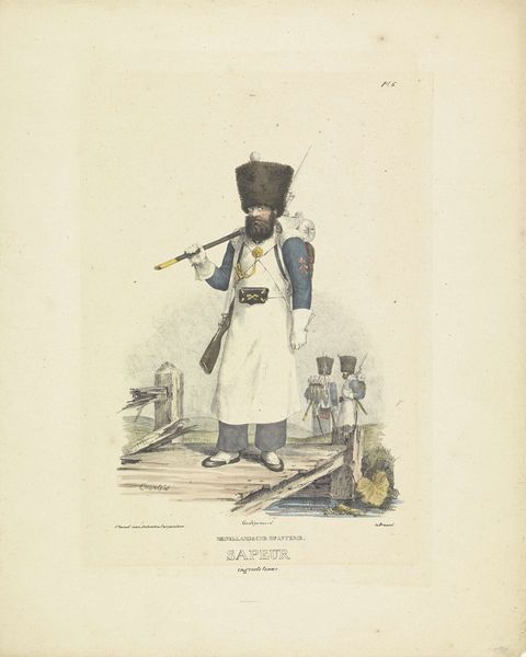 Editor: Here we have "Sappeur, 1820-1825," a watercolor and print by A. Courtois. The figure’s stark white apron and massive fur hat really grab your attention, especially set against the muted tones of the background. How would you interpret this work based on its form and structure? Curator: Note the carefully constructed planes that define the figure. Courtois juxtaposes the softness of the watercolor medium with precise lines defining the uniform's details. The stark white of the apron acts as a pivotal element. Consider its function, visually isolating and accentuating the central figure. How does this compositional decision affect your reading of the overall piece? Editor: It does make the figure stand out. The eye is drawn to the apron, and then upwards to the hat and the subject’s face, even before noticing the other soldiers. Curator: Precisely. The deliberate use of contrasting textures also reinforces this hierarchy. Observe how the smooth expanse of the apron is countered by the rough texture implied in the fur hat. There is also the wooden barricade to his left, contrasting the men on the march on his right. What does this juxtaposition suggest? Editor: I suppose it speaks to the figure’s importance, maybe their specific, solitary role in a larger company of foot soldiers. I’m beginning to see how Courtois is guiding us through the painting with contrasts of color, texture and focus. Curator: Indeed, consider this close reading not just for this particular work, but as a method for understanding the intentions and underlying structure in visual art generally. What began as merely an illustration gains significantly by this kind of systematic approach. Editor: Absolutely, now I notice new relations of color and placement, the visual tools that shape our perception of the artwork. Thanks for sharing that perspective.