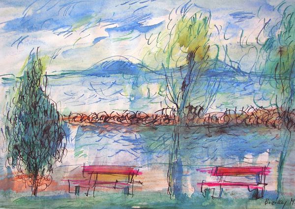 Curator: Looking at Maria Bozoky's 1981 piece, "Lake Balaton Paradise (Hungary)," one immediately notices the skillful layering of watercolor and pencil. It’s an exploration of form, line, and abstraction rendered with a distinctly impressionistic style. Editor: My first thought is freedom! A breezy day, sunlight dancing on the water. It feels less like a place and more like a fleeting memory. The colours swirl, almost like a song. Curator: Indeed. Consider how the layering of pencil—almost a frenetic scribble in places—interplays with the more fluid watercolor washes. There's a tension there, between the controlled mark-making of drawing and the almost uncontrollable nature of the watercolour. This likely mirrors the societal pressures felt in Hungary in that era against the freedom of self expression through abstraction in art, a period not always conducive to free artistic practice and production. Editor: I love that contrast. It’s like life, right? Moments of perfect clarity blurred by the rush of experience. That single, slightly askew chair in the foreground? It hints at a story, a person momentarily absent but surely about to return and complete the scene. It suggests accessibility and public utility but also private ownership and intimate perspective of the subject. Curator: I agree, that seemingly simple inclusion tells volumes. Bozoky's method encourages us to reflect on the interplay of art-making under strict regimes versus creative freedom, asking who has access and for what purposes art should serve. Editor: Absolutely. It transcends the picturesque and dives into something deeper – a sense of yearning, maybe? Curator: It's a subtle nod to how paradise itself might be constructed and deconstructed in collective imagination but achieved through individual effort using simple yet effective materials. The labour shows. Editor: Makes you wonder what Bozoky would create with absolute freedom! Still, constrained conditions or not, this picture stirs something wonderful. Curator: Absolutely. Bozoky’s material choices in service of subject and abstraction open a new dialogue and perspective on the landscape tradition, highlighting both its historical constraints and its capacity for reinvention through method. Editor: It's left me feeling lighter somehow, more hopeful. Almost ready for my own Balaton paradise.