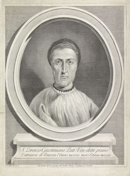 Curator: This is a print of Cardinal Giovanni Antonio Guadagni, likely dating between 1731 and 1780, by Rocco Pozzi. What are your immediate thoughts? Editor: There's an intensity to his gaze that really hooks me. It’s framed by this ornate oval, but that doesn't soften the directness of the Cardinal’s stare. He seems… resigned, maybe? Or perhaps just very, very tired. Curator: Prints like these served an important function. Beyond artistry, they were key in disseminating images of prominent figures. The Cardinal’s position—note his robes, the crests—all speak to power and status meticulously documented. Editor: Oh, absolutely! It’s almost like an early form of celebrity portraiture. Look how the engraver captured the texture of his garments and the slight imperfections in his skin—that realism, even in monochrome, adds to his persona. He’s no idealized saint. Curator: Consider too, the broader context. The Baroque period, even in printmaking, emphasized grandeur and detail to legitimize authority—spiritual or secular. Every element in this composition reinforces the Cardinal's importance. Editor: I get that. But there’s still something quietly rebellious in those eyes, as though a bit of Giovanni Antonio himself peeks out from under the weight of expectation. What was he thinking about, I wonder? Was he happy? Was he conflicted? Curator: What an insightful point. As historians, we may be able to place this print within specific historical power dynamics, but artistic skill prompts viewers to consider it not as historical record but instead invites contemplation on an individual's story, perhaps with unanswered questions about an era we could never fully access, of course. Editor: Exactly. Maybe art is less about definitively "knowing," and more about imagining possible emotional truth that resides beyond the historical certainties. Food for thought.