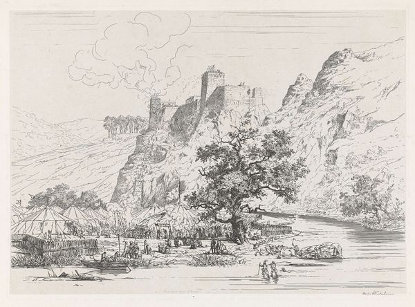 Muirhead Bone created this print, titled 'Stirling Castle, No.1,' using etching techniques. The composition is dominated by the formidable structure of Stirling Castle, rendered with a remarkable sense of scale. Bone's technique employs a network of fine, closely-spaced lines to define the contours of the castle and the steep, rocky hill upon which it sits. This technique creates a sense of depth and texture, inviting the viewer's eye to explore the intricate details of the architecture and landscape. The contrast between the solid, imposing castle and the delicate lines used to depict it creates a dynamic tension. The visual language of etching—the precision of the lines, the subtle gradations of tone—enhances the monumental quality of the subject. The interplay between light and shadow, achieved through varying densities of line, suggests an atmosphere that is both imposing and ethereal. It reminds us that even the most permanent structures are subject to the fleeting effects of light and time.