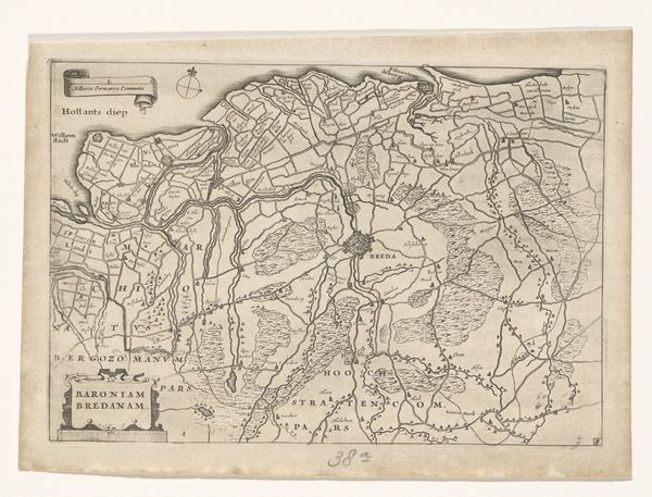 Curator: The drawing before us, "Kaart van het IJ, 1674 (linkerdeel)," or "Map of the IJ, 1674 (left part)," rendered in ink and etching, gives us a bird's-eye perspective of a crucial waterway in the Netherlands. Editor: Immediately striking is its austere geometry. It's less a romantic landscape, more a precisely rendered framework for understanding the region’s geography. The subdued ink adds to its formal nature. Curator: Maps of this period served not only to represent space, but to wield power. Cartography in the 17th century was intricately tied to trade, military strategy, and the establishment of territories. Creating and possessing such a map implied authority and control over that space. Editor: The crisscrossing lines seem almost ritualistic, less about simple distance and more about laying claim. The names carefully inscribed evoke ownership, a sort of visual incantation over the land and water. Does it speak to Dutch mercantile prowess? Curator: Absolutely. The IJ was, and is, vital to Amsterdam's commercial success. This map, while seemingly objective, reinforced Amsterdam's dominant position and influence within maritime trade routes. Think of the Dutch East India Company's expansion during this era. These precise charts facilitated that expansion, documenting navigable waters. Editor: Those lines create a powerful, psychological link to the territory itself. Consider how lines form enclosures and divisions, and dictate the direction of our eyes and thought. This austere map does more than give data; it establishes the very limits of a cultural perspective. Curator: And even this section, the "left part," signals a grander project. We aren't seeing a simple view; rather a section of something larger, alluding to further reach. It indicates ambition, hinting at continuous expansion of the frame of authority. Editor: This "Kaart" is a fascinating symbol then: less a straightforward tool for sailors, more an emblem of the projection of dominance. Looking closely has shown me a complex negotiation of landscape, power, and cultural self-image, encoded in sparse ink lines. Curator: Yes, by delving into the context and examining the map’s inherent symbolism, we move beyond simply noting its visual appearance to consider it as a critical component in constructing a historical narrative. A narrative deeply rooted in political and economic motivations.