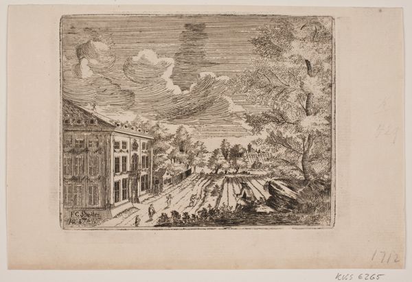 Editor: Here we have Michael Fosie's "Kirke i Italien," made around 1745. It's a print, an etching really, showing a church in what I assume is Italy. The detail is fascinating! I'm struck by the everyday life included around the grand building; it almost feels like a snapshot. What draws your attention in this work? Curator: Well, let’s think about the "how" of this image. This is an etching, meaning the artist used acid to cut into a metal plate. The act of mass production here transforms the Roman landscape, making it a commodity. How do you think that affects our understanding of this depiction of Italy? Editor: That's interesting. So, instead of a unique painting, this print allows many people to have the same image. Does that democratize art, making it more accessible? Curator: Precisely! But also, consider the labor involved. Who created this plate? Who printed it? Where was it sold, and to whom? The image of the church becomes a product of those processes. Look at how Fosie renders the working people in the foreground. Do you notice anything specific? Editor: I see, like, a shepherd and what looks like local commerce. They feel almost disconnected from the grandeur of the church, juxtaposing the lives of everyday people with the Church's grand presence. Is that disconnect intentional, perhaps highlighting social strata? Curator: I would agree. Furthermore, prints such as this fuelled the Grand Tour industry. Aristocrats desired these scenes as travel keepsakes, proof of their elite experiences. The materiality of this etching tells the story of art consumption in the 18th century. Editor: I hadn't considered it as a commodity before, but understanding its production and audience really changes how I see the image, highlighting the societal dynamics of the time. Thank you! Curator: My pleasure! By examining the labor and distribution, we can unveil many socio-economic conditions encoded in the artistic print itself.
