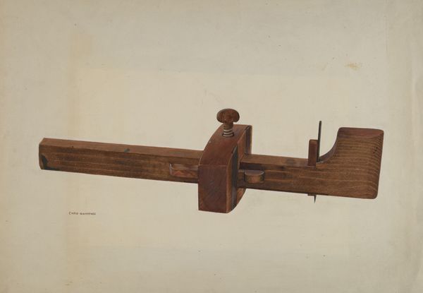 Curator: We're looking at Ralph Atkinson's circa 1937 artwork, "Economy 'Schnitzelbank'," executed with watercolor, charcoal, and pencil. The piece showcases what appears to be a woodworking bench of some kind. Editor: My immediate impression is one of simplicity. The limited color palette, the straightforward depiction of this utilitarian object – there's an honest and unassuming quality that really stands out. Curator: Indeed. A "Schnitzelbank" in this context is a traditional woodworking bench, central to the act of carving, shaping, and joining. Consider this image in light of folk culture and the inherent satisfaction derived from self-sufficiency. It’s an echo of hands-on skills and making something of one's own. Editor: That’s fascinating, considering how the piece emphasizes line and form so heavily. The precise, almost clinical rendering in line work contrasts beautifully with the muted wash of color, almost elevating the bench to something…symbolic? The planes intersect in a clean functional style—Bauhaus springs to mind! Curator: There is a powerful dignity and functionality within the cultural symbolism of creating physical objects. The bench isn’t just wood and nails; it’s an expression of resilience and adaptation within a changing economic landscape—the ‘Economy’ suggested in the title points to thrift and ingenuity during challenging times, especially in the lead-up to World War II. Editor: Interesting. Perhaps the artist is emphasizing that practicality is indeed beauty? Look how the composition draws your eye to the apparatus, how it captures this idea of solid weight in this everyday object—as though we could actually put it to work again. Curator: Precisely. We see history embodied in form and color. I find myself considering how essential the everyday acts of physical making become carriers of meaning across generations. Editor: Seeing the clean forms representing usefulness encourages us to find design value in ordinary instruments. It certainly changes how I perceive everyday life, thinking about craftsmanship in new and engaging ways.