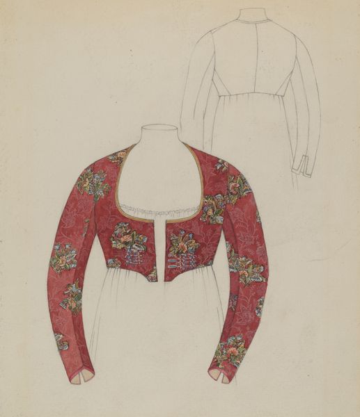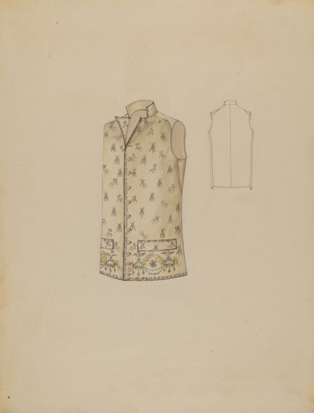Marie Mitchell created this watercolour drawing of a dolman, an over garment, sometime during her lifetime, between 1855 and 1995. The drawing presents a study in contrasts. The muted green of the dolman dominates the composition, its somber tone offset by the bright yellow lining peeking out from within the sleeves and front opening. The artist’s concentration on texture is evident in the meticulous rendering of the dolman’s trim. Look closely at the delicate, repetitive patterns that create a tactile richness, juxtaposed against the smooth washes of colour. Mitchell provides a semiotic key to understanding the values and codes of fashion through her careful observation and formal rendering. The drawing can be interpreted not just as a design study but as an exploration into the cultural meanings embedded in clothing. It challenges our perception of fashion illustration, inviting reflection on how design conveys status. Fashion itself functions as a language.