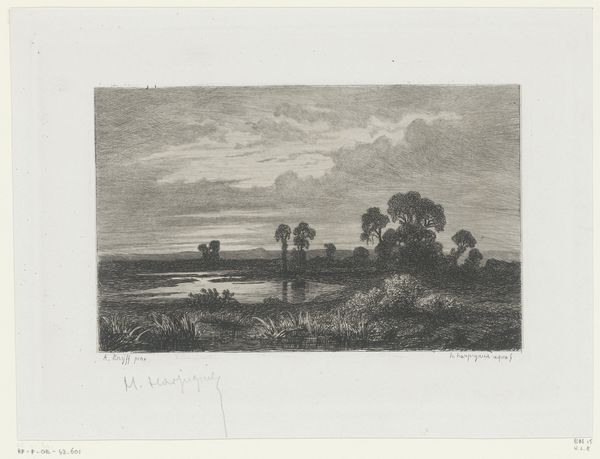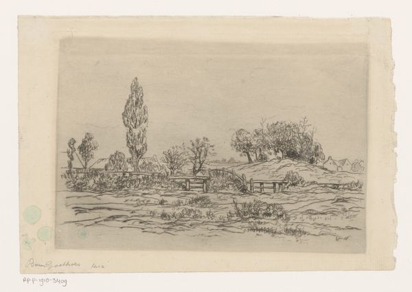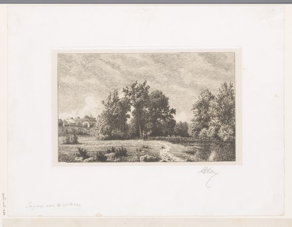 Editor: This is Jan van Lokhorst's "Landschap met boerin op landweg," created around 1858. It seems to be an etching, and the mood is quiet, almost melancholy. The lone woman figure really grounds the image. How do you interpret this work, particularly given the historical context? Curator: It's important to recognize how van Lokhorst situates this peasant woman within the landscape. The image speaks to broader 19th-century narratives about rural life, labor, and the role of women. We might ask, how does the artist frame her existence? Is this a celebration of rural life, or does it subtly critique the social and economic constraints placed on women like her? Editor: That’s interesting. It does feel quite romantic, but there's a hint of isolation in the woman’s posture. The dirt road she is traveling seems very long and somewhat arduous. Curator: Exactly! And how does that intersect with ideas of gendered space and mobility at the time? Women, especially those from the working class, often had limited freedom to move and act independently. Does the artwork perhaps point to that societal restriction even as it shows an apparently idyllic countryside? Editor: So you're saying we should consider how the image both reflects and potentially questions the power dynamics of its time? It definitely shifts my perspective on what I initially saw as just a simple landscape. Curator: Precisely. Art isn’t created in a vacuum; understanding the socio-political context is essential to truly engage with it. Editor: That’s a powerful way to look at art; I'll definitely be keeping that in mind moving forward. Curator: Wonderful. Considering those intersectional elements only deepens our appreciation.