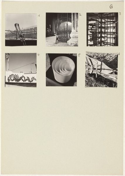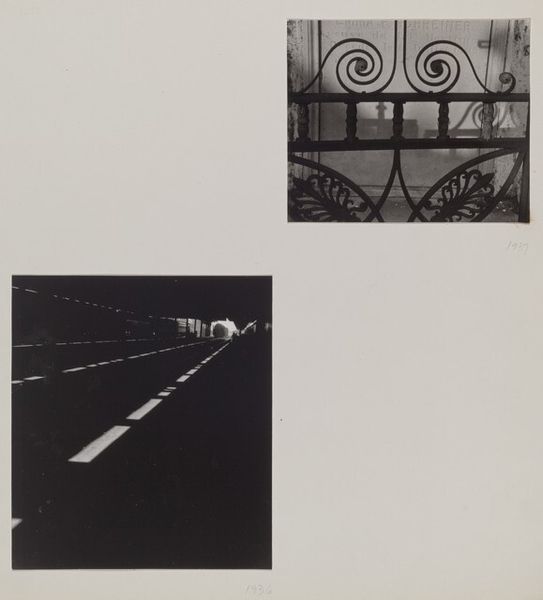 Curator: Here we have Nathan Lerner's gelatin-silver print, "Maquette, page 9," likely created between 1935 and 1944. Two images, seemingly unrelated, sit side-by-side on a larger photographic print. What is your first take on this? Editor: Stark, almost melancholic. The composition, this stark contrast of two small scenes on an otherwise large sheet, creates a feeling of isolation. And black and white... instantly makes me think about history, and lost worlds. Curator: Yes, history is definitely evoked here. On the left, a somewhat nondescript clapboard house and extension, and on the right, laundry hanging between buildings. I think Lerner is exploring everyday experiences through his keen understanding of light and texture using gelatin-silver which offers beautiful tonal gradations. We must also remember that Lerner made a living through commercial photography, including industrial design for Sears-Roebuck; so, attention to craft, the actual material, may have driven him to bring that to the artworld as well. Editor: Hanging laundry… that's practically a symbol of the working class. And a signifier of 'domesticity', perhaps a beacon of order, hanging amongst chaos. In tandem with this is a view of the back of the house—almost like peeking behind the scenes. Does the stark contrast speak to duality and private lives? The interplay makes me wonder about hidden narratives, almost a filmic sense of unfolding a story from fragmented clues. Curator: Fascinating idea! This contrast could reference how we manufacture meanings from the material conditions and also personal desires. By juxtaposing architectural structure and items that soften it, it may even call our attention to how these materials have changed hands, moved through economic circles. Did those objects start somewhere else only to end here, becoming objects to use, care, then throw? How might they shape identities tied to consumption, labor and the idea of "home?" Editor: That's true! What do we keep from the original intentions once objects or even buildings begin their 'lives', their new narratives after arriving. To what extent does the photographer intend to ask those questions versus using symbolic associations of light, shape and scale? What memory-work does his project ignite? Curator: These are key questions about this photograpgh! To consider Lerner’s process gives rise to considering the power of how we reassemble narratives within a frame – photographic or ideological – and how this relates to the world as a larger workshop of material significance and possibilities. Editor: Yes, and how poignant these modest icons of shelter and care are to contemplate now, inviting us to delve into both the familiar and the overlooked meanings around us.