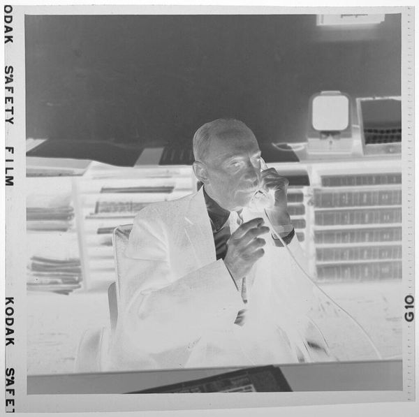 Curator: This photograph, attributed to Jack Gould, captures a man sitting at a table with microphones, likely around VE Day. The image is quite small, only about 4 by 5 inches. I find it quite evocative. Editor: The inverted tones give it an eerie quality, as if we're peering into a memory rather than a celebration. There's a tension between the implied joy of VE Day and the starkness of the composition. Curator: The presence of the microphones suggests a broadcast, connecting this individual to the broader historical moment. The image also offers a glimpse into the media landscape of the time. Editor: And the Republican elephant in the background raises questions about whose voices were amplified during that era and whose were silenced. This is not just about VE Day; it's about power. Curator: Exactly. The image speaks to the powerful forces that shape historical narratives. Editor: It reminds us that even moments of collective celebration are often experienced differently depending on one's social location. Curator: A poignant reminder of the complexities embedded within historical moments. Editor: Indeed, a study in contrasts and unspoken narratives.