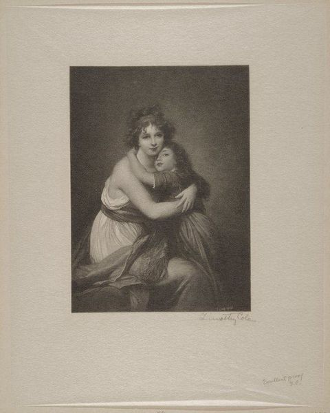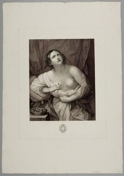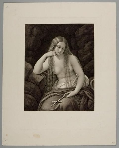 Curator: Here we have Christian Julius Gustav Planer's "Magdalen Reading," housed here at the Harvard Art Museums. Editor: The darkness is almost suffocating, yet that figure seems illuminated from within, a beacon in the gloom. What an evocative use of chiaroscuro. Curator: Indeed, the careful gradation of light and shadow creates a dynamic tension, focusing our gaze on the Magdalen and her book. The printmaking process allows for such subtle tonal variations. Editor: I wonder about the context, the labor involved in this image's production and dissemination. Was this a mass-produced item, bringing high art to a wider audience? Curator: Certainly, the composition directs us to the central figure, the gentle curve of her arm mirroring the open pages of the book. It is all quite deliberate, a study in contrasts. Editor: It speaks to the changing perceptions of women and literacy, particularly through the lens of religious subjects. Curator: Planer compels us to consider the composition as a symbolic landscape of spiritual contemplation. Editor: It is fascinating to consider the material culture surrounding images like these.