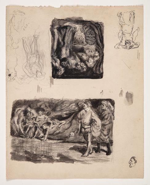 Oluf Hartmann made this study using graphite on paper. The quick, expressive lines suggest a process of rapid observation and improvisation. The artist has captured various figures and forms, with some areas densely worked and others left as mere suggestions. The immediacy of the graphite medium allows for a direct connection between the artist's hand and the paper's surface. The weight of the graphite varies, creating depth and contrast. The torn edges and collage-like composition of the work speak to a studio practice of experimentation and reuse, a kind of 'making do' attitude that can challenge our conventional expectations of a finished drawing. The work’s aesthetic is one of process and raw labor. Hartmann's willingness to expose the underlying structure and provisional nature of his work invites us to see beyond the finished image and appreciate the energy and effort involved in its creation. This approach breaks down the traditional hierarchy between finished art and preliminary studies.