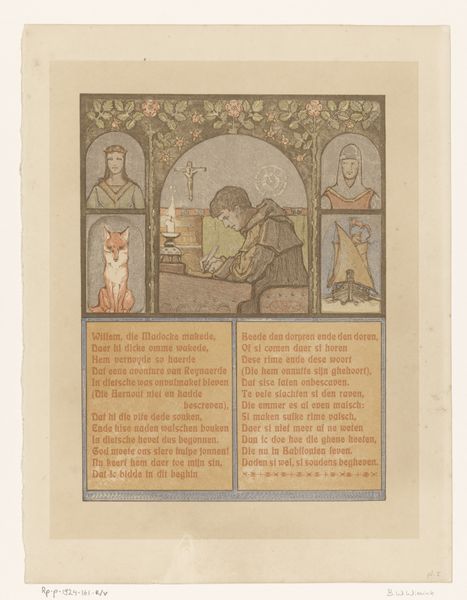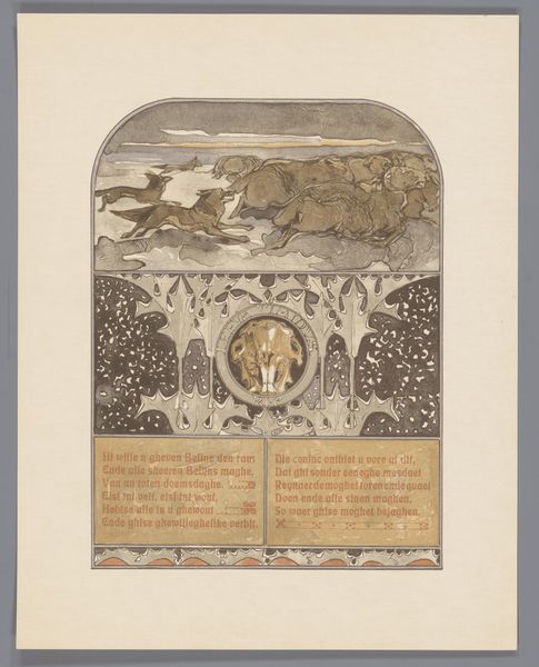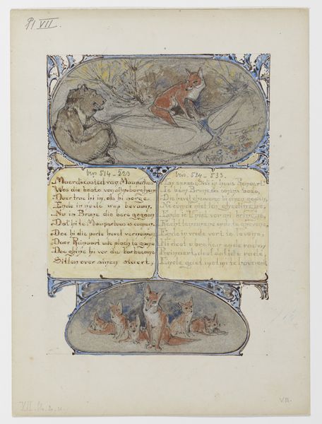Editor: This drawing, “Beer (Bruun) en vos (Reinaert)” from 1910, by Bernard Willem Wierink, employs ink and watercolor on paper. There's a medieval illuminated manuscript feeling to the piece. What strikes me is the depiction of the animals and their social interactions – the sly fox, the imposing bear... How do you interpret this work? Curator: I'm drawn to the material reality of this work. Look at the paper itself: aged, toned. This speaks to a specific moment in production and consumption. The choice of watercolor and ink, readily available and relatively inexpensive mediums, suggests a conscious decision regarding accessibility and the intended audience for this narrative. How might Wierink’s material choices challenge conventional distinctions between "high art" and illustration at the time? Editor: That's an interesting point. So you’re saying the materials used influenced how it was received, potentially blurring lines between fine art and popular forms? Curator: Precisely! And consider the repetitive nature of illustration for narrative works. Was this created for individual appreciation, or mass production? These printing processes significantly democratized art, making it accessible to a broader segment of society than traditional oil paintings. And how did this new kind of artwork affect craftmanship’s market? Editor: So by examining the materiality and intended consumption, we're actually revealing a larger story about art's role in society at that time. I never thought of looking at it from this angle! Curator: Indeed. The materials and the potential mode of reproduction are entry points into understanding the artwork's cultural and economic significance. Every artistic choice reflects an artist’s intention to communicate within a defined socio-economic sphere. Editor: That really reframes how I see this piece. I'll definitely look at art materials with new eyes from now on.