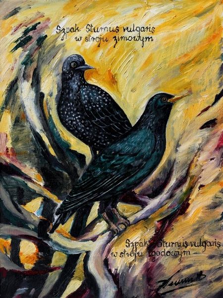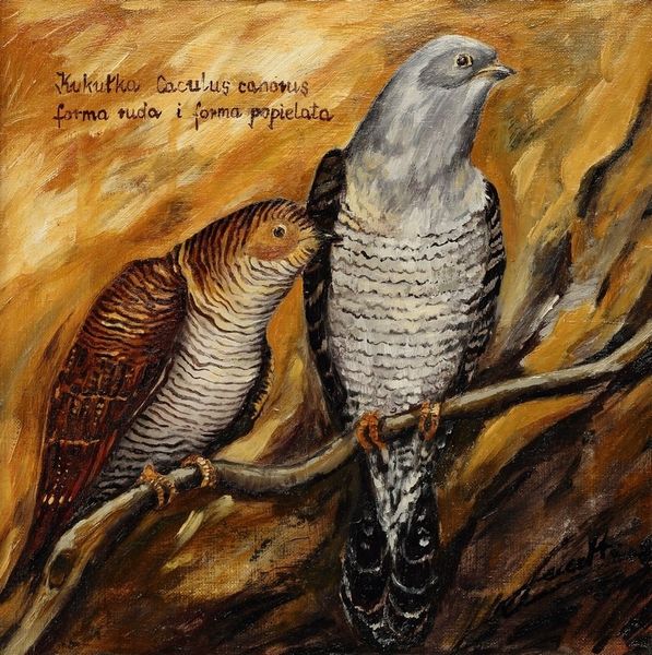 Curator: This is "Birds VII," an oil painting by Małgorzata Serwatka. I’m immediately struck by the muted palette. It gives the birds a sense of quietude, almost melancholy. What catches your eye? Editor: I notice first the visible brushstrokes, applied so thickly they create a very tangible texture. This adds to the rustic and grounded feel of the image. Do we know anything about Serwatka's studio practice? Curator: Not specifically, but we can see from the density of the oil paint usage, especially in creating depth in the clustered birds and their nestlike perch, a deep material interest. The very visible handling suggests that Serwatka comes from a tradition of ‘craft painting.’ Editor: Yes, the way Serwatka layers those brushstrokes mimics, even honors, the laborious tradition. I’m drawn to the formal aspects too - the soft diffused light and muted palette create a unifying tone despite each bird displaying an unique texture and pattern. I think that even a naive, primitive composition creates balance, no? Curator: That contrast between labor-intensive production and folk-art style is especially compelling when you consider the market this painting operates within. To engage with themes from this visual perspective becomes its strength. There is almost a sense of quiet protest, no? Editor: An interesting thought! I still return to the technique: notice how each bird has subtle, gradated shadows adding a roundness and dimensionality to the whole composition. It’s expertly done in what initially might seem an unassuming manner. Curator: Right, the charm isn't accidental. The artist consciously evokes and upends what the viewer thinks "primitive" artwork can accomplish. Serwatka's method pushes against the assumed definitions, asking: What does "skilled" craftsmanship look like? Editor: This push and pull, both material and art-historically engaged. It’s a thoughtful approach. I come away considering my notions about skill and authenticity. Curator: Me too. There’s far more intention beneath the surface. I might never look at ornithological illustration, again, in the same way.