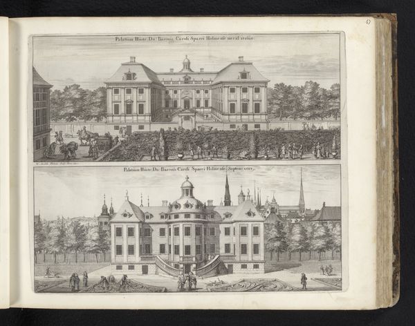 Editor: Here we have "View of Ericsberg Castle from the West," an engraving on paper by Willem Swidde, created around 1690. It feels so precise, almost architectural in its detail. What compositional elements stand out to you? Curator: Immediately, I'm struck by the meticulous execution of perspective. Note how Swidde employs a rigorous orthogonal structure to render the castle and its surrounding landscape. The symmetry, or near-symmetry, lends the image a certain formal quality. Do you notice any disruption of the symmetry? Editor: Yes, the scattering of the trees in the foreground definitely interrupts the strict geometric forms in the castle. The landscaping softens the hard lines a little. Curator: Precisely. It is a strategic artistic choice. By juxtaposing the organic with the geometric, Swidde creates a visual tension, drawing the viewer’s eye through the composition. What about the materiality, how does the printmaking technique inform the reading of this piece? Editor: Well, the engraving gives it this stark contrast, like a drawing in high definition. The textures feel almost graphic because of the sharp lines of the engraving. Curator: Exactly. The engraving process allows for very fine lines, facilitating the details in the architecture but also contributing to the stark contrast. The use of light and shadow is also interesting – what does that highlight in your opinion? Editor: Definitely the grandeur of the building, the architectural details of Ericsberg Castle. The darkness of the trees sort of enhances the building’s imposing presence. I had not thought about it like that at first! Curator: Considering those interplay between light, form and texture, the piece really demonstrates how much visual information an engraving could hold, particularly about the social importance attached to such an estate. Editor: It’s amazing to consider how much the engraving contributes to our reading of the overall landscape as being balanced between artifice and nature.