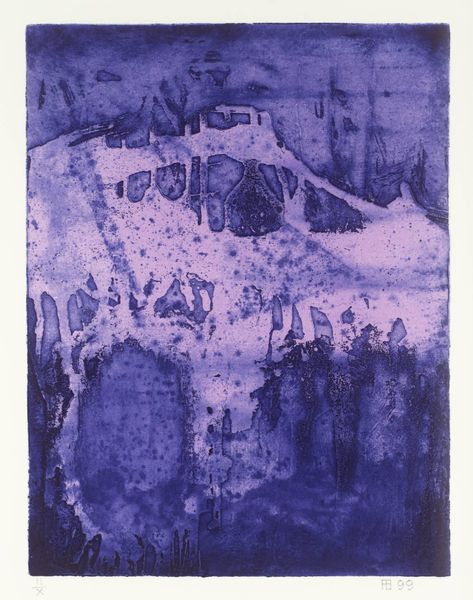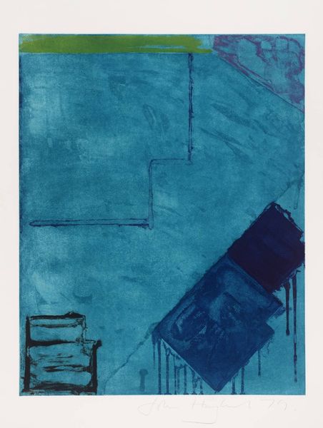Curator: Sidney Nolan’s "Lighthouse," currently residing in the Tate Collections, immediately strikes me as a landscape of isolation. The stark contrast between the dark base and the fading blue heightens this feeling. Editor: I agree. This print almost feels like a visual poem about alienation. The lighthouse, traditionally a symbol of hope, appears fragile, almost dissolving into the stormy atmosphere. It makes me think about postcolonial identity and the search for meaning within fractured narratives. Curator: Absolutely, that interpretation resonates. Nolan, an Australian artist, often explored themes of national identity and belonging. The lighthouse could symbolize the precariousness of colonial structures and their impact on the landscape and psyche. The application of the print is interesting as well; its stark contrast provides a sense of anxiety and unease. Editor: And the textured surface, that ruggedness—it speaks to the physical and emotional challenges inherent in navigating a world marked by displacement and cultural negotiation. We have to wonder how the symbol of the lighthouse shifts when understood through the diaspora. Curator: It really makes one consider the artist's intention and how it resonates with modern audiences. Thank you. Editor: Indeed, a potent reminder of art's capacity to illuminate complex truths.