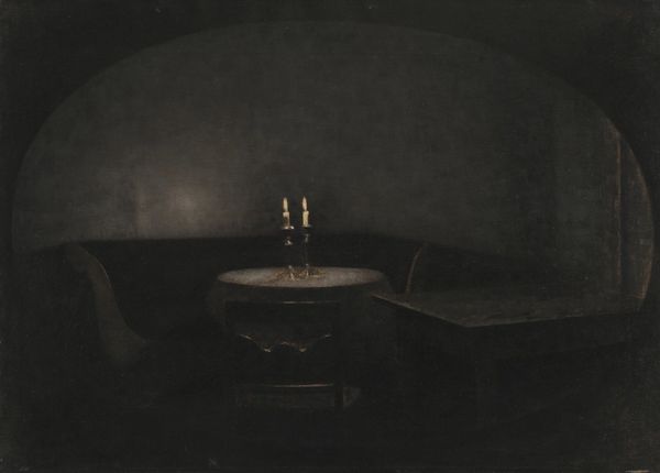 Editor: This is James Casebere's "Barrel Vaulted Room." The photographic print gives off an eerie, almost dreamlike feeling. How would you interpret the spatial relationships and the use of light in creating this mood? Curator: Note how the architecture is distilled to its purest geometric forms: the arch, the rectangle. The light, seemingly emanating from nowhere, sculpts these forms, creating a stark contrast. Observe the tonality; cool blues and grays dominate. Editor: So, it's the interplay of form and light that evokes the emotional response? Curator: Precisely. The composition invites a semiotic reading, where the absence of detail amplifies the emotional impact. Editor: I see. It's less about what's there, and more about how it’s presented. Curator: Indeed, and that’s where the true artistry lies, wouldn't you agree?
