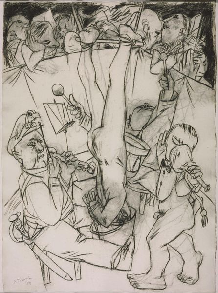 Curator: This drawing, about 55 by 76 centimeters, is Peter De Francia's "Prometheus Steals the Fire," part of the Tate collection. The raw, almost frantic line work immediately evokes struggle. Editor: The composition is compelling—the human figures are rendered with such angularity, it highlights a sense of brutal conflict between the figures. The owl in the top left, in contrast, appears watchful and knowing. Curator: Right, it's significant that De Francia employed charcoal on paper, a medium conducive to quick, expressive marks. It bypasses the constraints of traditional academic painting, aligning with a more immediate, socially engaged practice. Editor: The shackles are a powerful motif. Prometheus is not only stealing fire but also liberating humanity from the bondage of ignorance or oppression. Curator: Absolutely. The artist's rendering of the human form as almost grotesque serves to critique power structures, perhaps reflecting the social unrest of his time. Editor: It certainly makes you consider the ongoing relevance of the Prometheus myth—the eternal tension between progress and punishment, knowledge and its consequences. Curator: It makes me consider the labor conditions in which De Francia made his work. Editor: Indeed. A potent drawing that brings ancient myth to the present. Curator: The materiality and social context add further weight to the piece.