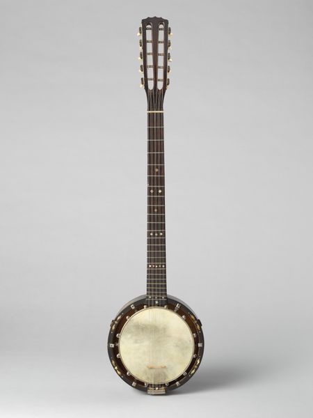 Curator: The artwork before us is simply titled “Oud,” a photograph taken in 1916 by Manol, also known as Emmanuel Venios. Editor: It’s so strikingly… staged. A photograph, yes, but treated with such meticulous attention to detail and clarity. The texture of the wood and the opalescence of the inlay are brought forward— it’s reverential. Curator: Absolutely. What's fascinating is how this intersects with photographic trends of the early 20th century—pictorialism blurring into a sharper, more documentary aesthetic, particularly around representations of material culture. Here we have what might normally be found on display within an Islamic art context now elevated via this medium of photography. Editor: Considering it was photographed in 1916, during a period of both Ottoman decline and burgeoning nationalism in many regions including Egypt, makes you wonder about the choice of subject—an oud, a traditional instrument emblematic of Arabic and Ottoman musical traditions. Curator: That’s very interesting. It seems this piece acts almost as a preservation of an aesthetic object. A means of maintaining tradition despite the political shifts of the time. Beyond this, however, Manol draws clear parallels between "art" and "craft", especially given photography's place within hierarchies of art practices, at that point. He insists on the visual and material impact that emerges between the interplay of wood, pearl, and careful craftsmanship. Editor: You can almost hear the instrument's absent music by truly examining the textures. I mean, this wasn't just casually documenting. There’s a social message interwoven here about cultural continuity. Curator: It also makes one consider the social circles in which Manol and his works participated: The early twentieth-century Parisian art world, its embrace of different cultural aesthetics… I feel like its very presence on display in our museum brings up many considerations about how we value artistic traditions within various contexts. Editor: Exactly, how socio-political dynamics influence production and consumption of visual symbols— fascinatingly intricate and very worthwhile food for thought, indeed.