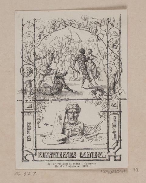 Editor: So, this is Pieter de Josselin de Jong's "Gedenkblad van Vox Studiosorum...", created in 1889 using ink for both drawing and printmaking. It feels very celebratory and grand, but I'm not sure what's being commemorated. What do you see in this piece? Curator: It's definitely celebratory, and it's crucial to look at its context. This print commemorates the 50th anniversary of the Minerva student society in Leiden. Look at the central figure on the stage, he represents a member of the student body giving a speech to celebrate the society. Does that reading influence your understanding of its imagery? Editor: Definitely! The female figures to either side, then, are symbolic… perhaps of wisdom and opportunity? And the crowd feels very… male. Were women a part of this society in 1889? Curator: Exactly. Consider the societal structures of the late 19th century. Student societies, particularly elite ones like Minerva, were largely exclusive spaces for upper-class men. This print becomes a document of that exclusivity, whether intentional or not. Look closely—how might contemporary theories about power and representation inform how we view this "celebration"? Editor: It does highlight how celebratory imagery can also inadvertently reinforce existing power structures. By excluding women, even symbolically, it’s almost like Minerva is preserving that dominance. It definitely provides more context. Curator: Precisely! Seeing this as more than just a historical record lets us discuss how institutions, even celebratory ones, can perpetuate or challenge social norms through their representation. Editor: That's fascinating. I went from just seeing a grand historical drawing to recognizing some less obvious elements of exclusion. Thank you. Curator: And I see a budding activist!
