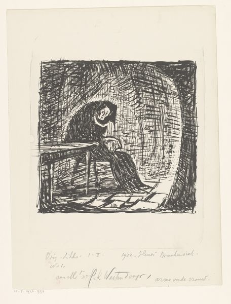 Curator: Walter Gramatté, who lived from 1897 to 1929, created this stark image, "The Titular Councilor Akaki Akakijewitsch." It's currently held in the Harvard Art Museums. Editor: It’s haunting. The figure seems hunched, consumed by the desk before him. The heavy shading gives it an almost claustrophobic feel. Curator: Gramatté was associated with Expressionism, and here we can see some of its concern for the emotional weight of modern life. Editor: I think the power of the image is in how it transcends its time. It speaks to the alienation of labor, of being swallowed whole by the work. I feel the same in front of my computer! Curator: Well, this resonates particularly because Nikolai Gogol's story explores the dehumanizing effects of bureaucracy on an individual. Editor: I find that even knowing that, what stays with me is that feeling of being caught, trapped within the frame. Curator: It's a powerful example of how art can draw us into a shared experience of being human, even when the details seem specific to a time. Editor: Definitely. This makes me reflect on what work *really* means to me.