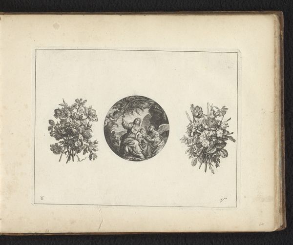 Curator: Here we have an engraving from around 1650-1676, "Horlogekast met de Heilige Familie op de vlucht naar Egypte," currently held in the Rijksmuseum, and attributed to an anonymous artist. Editor: What a curious composition! It feels like a juxtaposition of sacred narrative and ornamental design—like someone couldn’t decide between illustrating a Bible story and a florist’s catalogue. Curator: Indeed. What strikes me is the very practical purpose such a print might have served. Consider the market for decorative arts during the Baroque period; this image isn’t just art for art’s sake, but a template, a model. Editor: Are you suggesting it served as a clock case design? Curator: Exactly. And not just for the wealthy elite. Printmaking democratized imagery, bringing this level of detail, both the religious scene and the floral motifs, to a broader consuming public. It's not about high art; it is about affordable access. Editor: But there’s also something deeply satisfying about the contrast, regardless of its utility. Look at the central roundel: the hurried figures of Joseph, Mary, and the infant Jesus, rendered with a delicate hatching that conveys movement and vulnerability. The shapes play off each other nicely. Curator: And the floral arrangements! Not merely decorative, but products of very specific horticultural labor and trade networks. Imagine the consumption practices needed to maintain such floral arrangements and making it fashionable. These elements of production and consumption are worth observing. Editor: Perhaps it is simply the symmetry of these decorative patterns that offers respite, almost meditative in contrast with the story's upheaval. The dark lines, the delicate rendering...there is visual comfort in its balance. Curator: Perhaps it’s the meeting of spiritual narrative and daily material concerns. Think of the craftsman following this design, engaging not only with his craft but with these socio-economic contexts as he or she toils to translate into three dimensions the intentions within the two. Editor: I appreciate how our focus on the visual or material brings something very specific, something unique. Thank you! Curator: Thank you. Viewing it from a different angle allows for more insights.