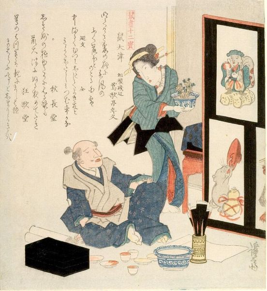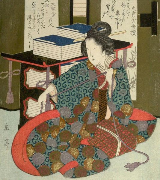 Editor: This woodblock print by Utagawa Kunisada, titled "Actor Ichikawa Monnosuke 3rd in Dressing Room with Ichikawa Onozo," has such a sense of intimacy. The composition is so carefully arranged with the mirror and the figures. What do you see in this piece? Curator: Indeed. Note the interplay between the flat planes and the illusion of depth created by the mirror. The artist juxtaposes the detailed floral patterns of the robes against the relative emptiness of the mirror's surface. How does this formal contrast strike you? Editor: I see that it highlights the performative nature of identity. The mirror reflects a constructed image, not a true reflection. Curator: Precisely. The composition and color palette serve to underscore the themes of performance and representation inherent in the subject matter. Editor: That’s a great point. Thanks for expanding my understanding of the image. Curator: My pleasure. It is through such formal analyses that we gain deeper insight into the artist's intentions.