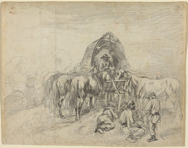 Johan Thomas Lundbye made this illustration in 1843 using pen, ink and wash on paper. The artist has used these materials to create a sketch-like impression, with delicate lines defining the architecture of the rural scene. Notice how the washes of color add depth and volume, particularly in the depiction of the horses. The choice of pen and ink gives the image a directness, reflecting Lundbye's intention to capture the essence of everyday life. Illustrations like these were often made as preparatory studies, or as independent works intended for reproduction and distribution. It is a reminder that art making is work. This piece offers a glimpse into the rural life of 19th-century Denmark, emphasizing the value of craft and artistic skill in representing ordinary subjects, rather than just high art.