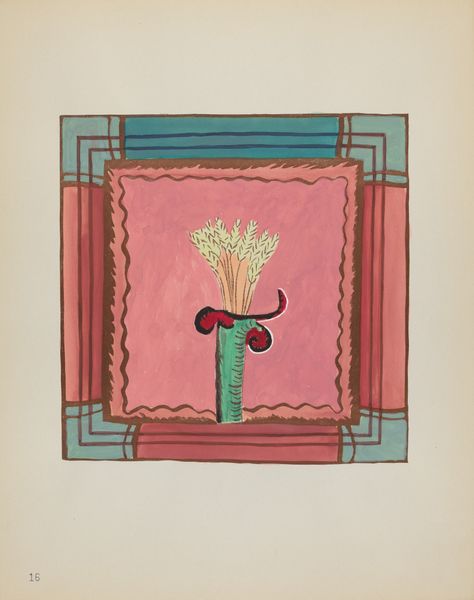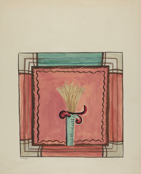 Editor: We're looking at Plate 17: Grapes, an altar panel from the portfolio "Spanish Colonial Designs of New Mexico," made between 1935 and 1942, using watercolor. I'm struck by how the pink background clashes beautifully with the teal-ish leaves, almost like a vibrant folk tapestry. What is your take on this piece? Curator: Oh, it sings to me of home and heritage! It is a humble piece that is somehow transcendent, no? I picture the artist, surrounded by New Mexico light, interpreting tradition through a distinctly personal lens. The somewhat naive rendering adds to its charm. Editor: Naive, yes, I see that! Like a child’s drawing elevated by skill. Do you see specific influences or inspirations? Curator: Absolutely! The echo of traditional Spanish colonial design is strong, yet it feels filtered through the American experience, with maybe a hint of art deco. The grapes themselves symbolize abundance and the sacred, connecting it to the altar panel designation, implying it held spiritual resonance for its creator and original audience. Don't you think so? Editor: It is compelling to consider that duality, and the choice to use grapes specifically. Almost like it is merging two identities or stories. Curator: Precisely! And maybe even a whisper of rebellion in its colour choices, it diverges from strict tradition! A silent but confident reinterpretation. What an elegant subversion. It warms my heart to consider the artist. Editor: It does recontextualize its colonial heritage through indigenized aesthetics, quite profoundly so. Curator: I completely agree! A visual bridge, linking the past and the present with grace. A reminder that beauty often resides in unexpected places, isn't it? Editor: Definitely. Now, I will keep an eye for details in less-known art like this!
