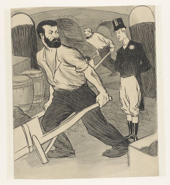 Jan de Waardt made this drawing, "Owner of Factory with Deceased Wife of a Laborer," in the Netherlands, at the turn of the 20th century. It likely appeared in a satirical magazine, judging by its caricatural style and polemical subject. The image depicts a confrontation between a grieving working-class man and a well-fed factory owner, next to the corpse of the worker's wife. De Waardt uses strong contrasts to highlight the social disparities between the two men. The owner's expensive suit and complacent demeanor contrast with the worker's coarse sweater and accusatory stance. This stark imagery is reminiscent of the progressive art of the time, particularly in Germany and France, which often sought to expose the injustices of industrial capitalism. Examining Dutch social and economic history can shed light on the specifics of this image. It is important to consider what types of factories existed in the Netherlands at this time, and whether their owners were typically so detached from the working conditions of their employees.