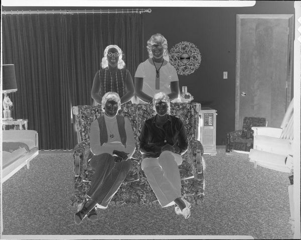 Curator: This rather haunting silver gelatin print, simply titled "Untitled (portrait of family in trees)" is attributed to Lucian and Mary Brown. There is a starkness to this image. Editor: It's like a memory fading—the figures nearly consumed by the woods, the reversed tones adding a surreal quality. The composition feels both deliberate and strangely unsettling. Curator: The darkroom process itself must have been incredibly tactile; the act of reversal transforms a familiar setting into something ethereal. Editor: Absolutely! This is all about the materiality of the photographic process itself—the emulsion, the development, the deliberate manipulation. Were they emphasizing the artificiality of the family portrait? Curator: Perhaps it's a comment on the artifice inherent in posing, the fleeting nature of family, or maybe just a playful exploration of light and shadow. Either way, its captivating. Editor: The image really makes you think about how much labor goes into not only the picture, but also the production of Kodak film itself. Curator: Indeed, it’s a ghostly reminder of the alchemy that happens between subject, artist, and the very stuff of photography. Editor: This photograph’s manipulation of process helps me see the unseen labor in the history of image-making.