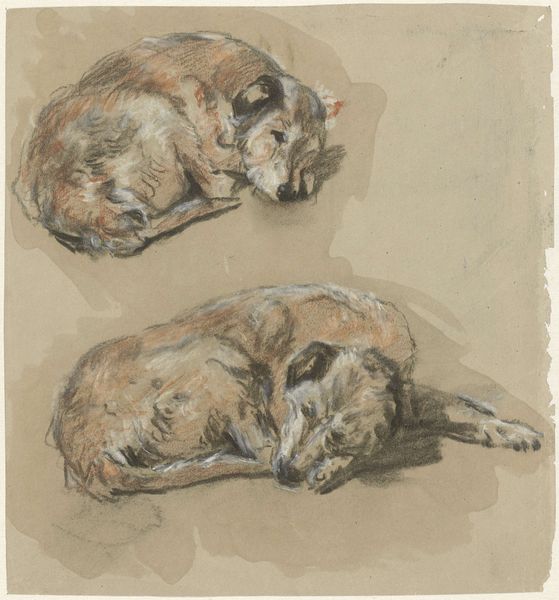 Editor: This is James Ward's "Studies of Dogs Lying Down," created using pencil and charcoal. There's a real sense of calm here; they look so peaceful and tired. What stands out to you? Curator: Peace is a key ingredient, I think. Dogs are such emotionally resonant creatures, burdened with a loyalty and obedience so that an image of their stillness suggests contentment. Consider how dogs were represented in earlier eras. Often they are symbols of faithfulness, valor, and wealth-- particularly within royal portraiture or heraldry. This piece reduces the symbolic load and increases empathy, and invites reflection upon our relationship to animals, now detached from hunting and protection and recast through love. Does the medium itself play a role? Editor: The use of pencil and charcoal definitely gives it a softer feel, less formal maybe? Almost intimate? Curator: Precisely! Think about the implications. Drawings like these would typically serve as preliminary sketches for larger, more ambitious works: paintings destined to represent the powerful or document significant events. So how does it change our interpretation to encounter them alone, divorced from their presumed purpose? Does it change your reading of realism? Editor: It does. They feel… less posed? More like a private observation of a common moment. The texture invites to reach out and feel the dogs, soft fur. Curator: Right! It makes one wonder what it suggests that the quotidian has been embraced, the common now considered artistic material. We are used to seeing studies of humans to show muscles, not really the animals. It makes this drawing a reflection on domesticity as well. Editor: That makes me consider my own pets differently! It feels like this work gives inherent value to them, to animals, as part of a loving domestic context. Curator: And by extension to love, companionship and the quotidian joys of connection to animals.