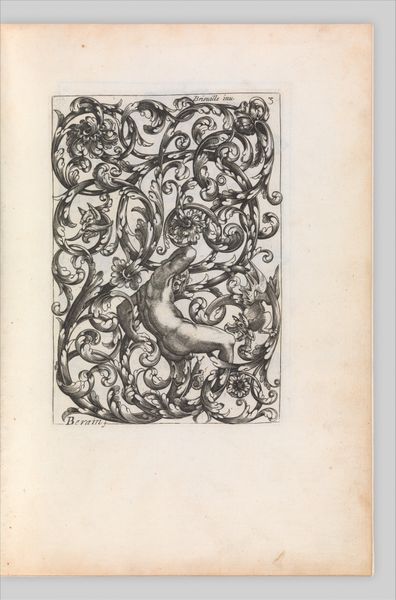 Curator: Here we have "Diverses Pieces de Serruriers, page 7," a pen and ink drawing by Jean Berain, created sometime between 1658 and 1668. It's currently held in the collection of the Metropolitan Museum of Art. Editor: Immediately, I’m struck by the opulence, but there is also a certain restraint. The tight lines of the penwork create a delicate and intricate design. I am trying to read it and decode this ornamental structure. Curator: Berain was a designer, and this page is one of a series of engravings showcasing designs for metalwork. You can see this Baroque style flourishes here – swirly acanthus leaves and stylized figures. It really encapsulates the era's love of ornamentation. Editor: The figures, the allegorical creatures almost hidden amongst the leaves and scrolls... there is a kind of mythology alive within it. Given that this would be replicated in metal, did that alter the cultural meaning or accessibility of the images? Were these displays of wealth accessible to everyone or designed just for the few who commissioned the artwork? Curator: Well, that's a key aspect to consider. The symbolic meaning embedded in this artwork carries potent information. I'd say it was definitely targeted to wealthier clientele, where the meaning and design are communicating and mirroring social class. In effect, they acted as emblems of prestige and cultural sophistication, perpetuating hierarchies of status. Editor: Right. This seemingly decorative sheet thus becomes an instrument for encoding, displaying, and reinforcing the period's power dynamics. I think this is fascinating to realize that art is deeply connected with political history. Thank you. Curator: Thank you for that reading of the piece and raising awareness of how ornamentation interacts with broader power dynamics.