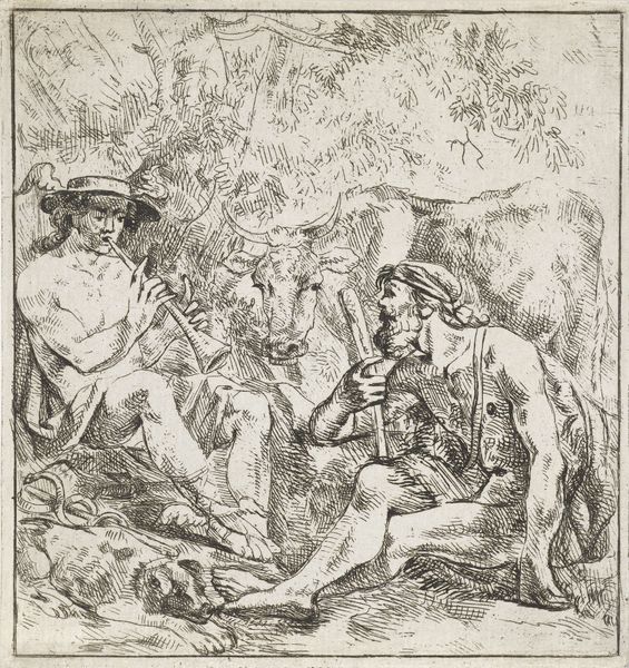 Curator: The work before us, "Mercurius, Argus en Io" by Jacques Kuyper, dating from 1771 to 1808, presents a scene steeped in classical mythology. What strikes you first about this print? Editor: The density! It's like a forest of lines, all cross-hatching, creating a real sense of enclosure and shadow. Almost claustrophobic despite the ostensible outdoor setting. Curator: Indeed, Kuyper’s meticulous engraving technique shapes the narrative. Mercury, recognizable by his hat, lulls Argus, the many-eyed giant, to sleep with music so he can free Io, who has been transformed into a heifer by Jupiter. This resonates with historical power dynamics, doesn't it? Jupiter's abuse of power, Io's forced transformation, and Mercury’s cunning—a powerful commentary on the vulnerabilities of those in marginalized positions. Editor: Absolutely, but technically, note the contrast between the smooth curves of the bodies and the almost frantic energy of the foliage. He uses light and dark to build form with incredible precision. The way Argus leans, heavy and unsuspecting, is really well done. And that heifer looks almost spectral in the background. Curator: The depiction of Io as a heifer, perpetually watched and surveilled, echoes the historical objectification of women and the control of their bodies. Kuyper utilizes this classical story to highlight themes of freedom, captivity, and deception. We see Jupiter, in the original myths, using Io, she who represents the historical reality of many women rendered powerless in society. Editor: Do you think he pushes it too far, though? It feels a bit didactic. I'm not sure the composition really supports the weight of that reading. Maybe it’s a formal problem? The elements seem a bit too separate, competing for attention. Curator: Perhaps, but this is the period of enlightenment. Many artists use the artwork to give the viewer a new social understanding, and here we see clear references to class issues that were part of the discussion at the time. Editor: Still, regardless of whether the reading holds completely true or not, the command of light and shadow to create the scene, and convey the feeling in this space, can not be understated. Curator: Very true. The enduring power of the story, combined with Kuyper's technical skill, gives us ample ground for thoughtful discussion about history and the present day. Editor: A fitting end, don't you think, to this tour of Kuyper's rich, albeit shaded, world?