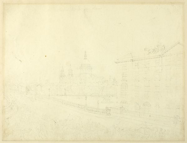 Curator: Here we have Bernardo Bellotto's drawing, "A Capriccio of Palaces and a Loggia Facing a Classical Bridge," created around 1765. It's rendered in pen and ink. What strikes you initially about this cityscape? Editor: Well, it feels very… orderly. Imposing even, with its precise lines and focus on architectural structure. Though a preliminary sketch, its clarity conveys ambition, aspiration... a potent sense of civic pride, maybe. Curator: Exactly. Consider Bellotto's process. As an artist deeply rooted in the tradition of vedute, or view painting, his method demanded accurate representation, and many drawings like this functioned as studies for larger paintings produced later. But not only as 'merely' preparatory tools! Here Bellotto is mediating between observed realities, that is to say a number of elements captured as ‘building portraits’, on the one hand and the ideal image and the playfulness and fictions surrounding the picturesque that underpinned the creation of his market. Editor: Ah, a composite vision! Because the iconography suggests more than a simple architectural rendering. The carefully constructed symmetry, the emphasis on verticality through columns and towers—these recall centuries of symbolic meaning associated with power, stability, and the idealized city. Is Bellotto intentionally drawing on those established motifs? Curator: Undoubtedly. Furthermore, the use of graphite lines—thin, controlled—allowing him to build a dense network, constructing in detail the scene before then reworking individual lines, as it shows its partial overworking with pen and ink, to accentuate particular points, give us hints on the labor involved. Editor: That labor adds another layer to our interpretation. Thinking about the relationship between human effort and these massive, idealized structures... it speaks volumes. And notice the presence of sailing ships, symbols of travel and discovery, nestled into the palatial city’s stage sets, it conjures this moment of both confidence and expanding social boundaries. Curator: Indeed. So, we move from the physical making of this detailed drawing as an object through considering its role as an element contributing to urban fantasies in print. Editor: Precisely. This drawing resonates powerfully on multiple levels. Thank you.