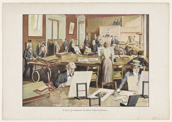 Curator: Immediately, I'm struck by the density of this composition, the organized chaos within the implied grid. All of the figures within contribute to the intricate narrative with clearly delineated shapes. Editor: Indeed. This engraving, "Boekbinderij," from 1875 depicts a bookbinding workshop teeming with activity. Its anonymous authorship places it squarely within a specific context of mass production and perhaps a collective, rather than individual, artistic vision. Notice how the industrial labor on display romanticizes pre-industrialized means of manufacturing as compared to the increasing influence of large-scale factories and companies on communities in that era. Curator: I observe a definite hierarchy in the visual plane. The figures closer to the picture plane are rendered with greater detail and dynamism. The engraver employs strong diagonal lines to pull the eye through the complex space, a technique which emphasizes labor through linear precision. It also showcases depth. Editor: And consider the socio-economic implications! Workshops such as these, especially during the late 19th century, were critical not only for producing printed materials but also as potential hubs of radical or progressive social reform. Books were seen as powerful objects of influence; in order to manufacture them at that time would also imply agency as it pertains to the proliferation of counter-cultural political awareness or popular opinions. Curator: You highlight an interesting aspect of access to information during that period. Thinking purely aesthetically, one might posit that the warm color palette is juxtaposed intentionally against the cold machinery, thus rendering an idyllic perception of a potentially strenuous manual labor environment. Editor: A point well taken, perhaps serving to offset or perhaps even counteract the very real-world challenges of labor during this industrial era. What stories these walls could tell. Curator: Exactly. As we pull our focus back from the immediate details, we see a unified composition carefully planned out by the engraver's deft hand and eye. I encourage all who view it to examine it through those principles as well! Editor: This peek into a bookbinding workshop serves as an example of an era that helped spread awareness as to the challenges to everyday life through a shift to mechanized industry, ultimately defining the complex socio-political ecosystem. Hopefully listeners walk away knowing the rich legacy this engraving invokes in our public memory.