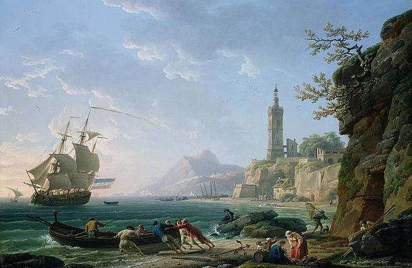 Curator: It feels like entering a stage play, doesn't it? Everything is poised. Editor: Indeed. The light is theatrical. We’re looking at Claude-Joseph Vernet’s "Fishing port at dawn" from 1774. Vernet, known for his marine paintings, really constructs a specific vision here, and through his work he's conveying the spirit of his time. Curator: Immediately, the way Vernet stages the rising sun hits me. Not merely depicting dawn but almost presenting it as a reveal. Dawn isn’t just a time; it's a symbol laden with possibility, loaded with meaning. Editor: Absolutely. Look at how Vernet balances the activities of daily life along the shore with that grand ship, a symbol of global trade and colonialism. He's idealizing labor alongside that emblem of power, which could prompt a critical consideration of exploitation inherent in maritime trade routes. How are we to regard that juxtaposition? Curator: And note the ruined temple perched above the cascading waterfall, echoed perhaps by that half-collapsed fishing weir stretching precariously into the sea! It's about cycles: civilizations, traditions, perhaps empires themselves, rising and then inevitably waning, giving way to new ones. Editor: That feels right. The scene itself presents this tension—it’s picturesque but also unsettling. It captures this transitional historical moment. The composition might almost belie the underlying tension between humanity's ambition and nature's immutable power, that can overturn and overwhelm ambition. Curator: But think about how he renders the light itself—it caresses those distant mountains and catches in the sails—a light of hope and new beginnings that touches even broken things. To me, it presents a message of continuous cultural renewal. Editor: I think it is much more ambivalent that that. I see how this painting speaks volumes about humanity's relationship with nature, with progress, and indeed with itself. What price that progress and renewal? Curator: In short, an artwork providing us with lots of questions and some tentative answers. Editor: Indeed, one painting and a sea of meaning.
