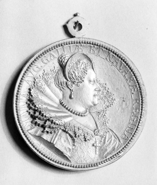 Curator: Here we have Giovanni Battista Nini's medallion, "Louis XV", enshrined at the Harvard Art Museums. Editor: It's so clean, almost sterile, yet there's something deeply human about the profile's gentle curves. The materiality, perhaps? Curator: Indeed, the terra cotta lends a certain warmth, contrasting with the formality of the portrait. Note the inscription, "LOUIS XV PAR LA GRACE DE DIEU, ROY TRES CHRETIEN". Editor: It feels like a whispered secret—or a boast etched in clay. It’s interesting how such a small object holds so much power and presence. It’s like a portal into the past. Curator: Precisely. The careful composition and inscription contribute to its symbolic weight. Editor: I guess this little artwork will stay with me for a while. Curator: As it should.