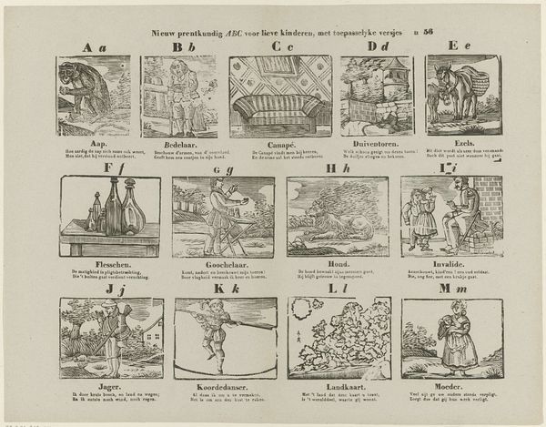 Curator: Before us is an intriguing print, its full title being rather a mouthful: "Het paarden spel is fraai om zien, / Ik zal er hier de schets van biën / Le tournoi bien souvent est beau, / Je vous en rendrai le tableau.” This pen and ink drawing with engraving, created between 1833 and 1900 by Glenisson & Zonen, seems to depict scenes of horsemanship and jousting. Editor: It feels like flipping through a deck of historical playing cards – little windows into another time! There’s a rough, whimsical quality to the lines, like a child’s imaginative doodle come to life, but about much darker matters... and what's with that tiny font crammed around the images? Curator: The artist seems to explore various aspects of what might be construed a form of academic art: horses in games, equestrian battle scenes, perhaps studies for a larger work given its nature of sketching, a sort of "genre" work in its own right. Editor: I find myself drawn to the chaotic energy in the composition. Though each panel is contained, the overall impression is frenetic, full of clashing lines and figures, it is all over the place really. Each frame, some complete, other seeming more abstract. Even those horses don't seem well made in comparison to our more contemporary understanding. There's a raw quality that I find endearing; there is also no clear narrative holding this all together. What are we to make of such things?! Curator: We observe figures both on and off horseback engaged in what appears to be playful or combative interaction, perhaps referencing various modes of aristocratic pastime as rendered by someone with the skill of illustration who nonetheless wasn't that invested to making things clean or properly made. The materiality and arrangement of elements is nonetheless successful, suggesting something intentional, though the layout perhaps a product of what was convenient? Editor: Perhaps the lack of "narrative" is the point. This isn't about a story but a mood, and the medium certainly reinforces the impression: this is all based on sketch art and drawings; we aren't necessarily meant to see finished perfection. It's fascinating how much historical context you can evoke with such a limited tonal palette. Curator: Indeed. The combination of history- and genre- painting with that particular period engraving style creates something that is rather a meditation on skill and how we, as spectators and practitioners are conditioned to accept an aesthetic ideal that this deliberately breaks or falls short of. Editor: The artist captures both an interest of a possible event or style through visual cues, while expressing that their work is always based on "sketch" or draft-like sensibilities to communicate with an audience of what will never be. It is melancholic for this and I've come to greatly admire the "frenetic" state after some contemplation, despite how chaotic the entire composition seems on initial review.