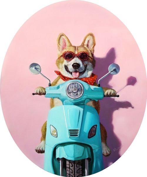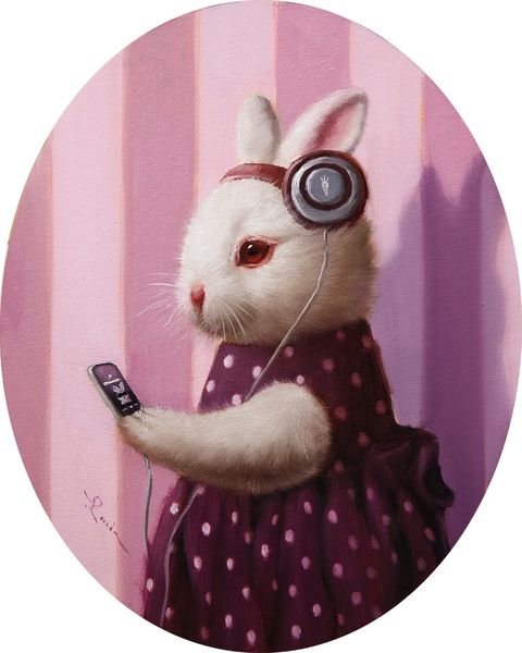 Editor: Here we have "Icy Treat" by Lucia Heffernan, it seems to be a painting, and the focal point is definitely that very cool koala. I’m struck by the composition. What visual elements do you find most compelling in this work? Curator: Formally, the painting is dominated by the circular format, almost like a stylized cartoon. The background, composed of vertical pink, white, and black stripes, creates a dynamic field. However, the stripes flatten the pictorial space. Editor: Yes, I noticed that flattening too. How does the koala interact with that space? Curator: The koala, rendered in a relatively naturalistic style, complete with sunglasses, is placed squarely in the center. The sharp detail in the koala, especially its fur and facial expression, creates a contrast with the flatness of the background. What purpose does this contrast serve? Editor: Perhaps to make the koala pop? I mean, to draw more attention to the subject and maybe create a playful juxtaposition between the real and the artificial? Curator: Precisely. The interplay of texture—the fur of the animal, the stripes behind it, and the geometric pattern of the ice cream cone, against the simple colour-scheme and shape, forms an integrated visual experience. This focus on the interplay of visual elements makes the animal portrait interesting beyond mere representation. Editor: It’s interesting how focusing on the visual components makes the image more than just a cute animal picture. I can definitely see that now! Curator: Agreed. The meticulous detail and interplay of form underscores the painting’s formal logic and invites continued viewing.
