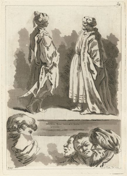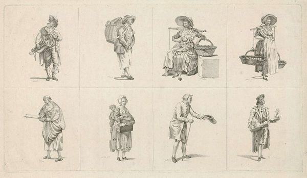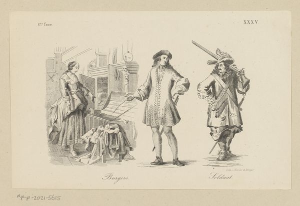Curator: Just look at this, would you? Pieter van Loon’s "Studies van vrouw met grote hoed en staande visser," likely from 1839. All soft graphite and hopeful intentions. Editor: Hopeful? To me, there's a weight to this sketch. The line work is heavy, almost labored, especially in the depiction of the fisherman's posture. You can sense the physical burden, not just of his net, but perhaps of his trade. Curator: Oh, but consider the sheer delight in the woman's hat! It's practically floating. See how light catches the brim, a cheeky defiance of gravity. To me it breathes optimism despite being a monochrome drawing. I find this incredibly powerful and almost fairy-tale-like. Editor: Defiance is an interesting take. I’m struck by the hats themselves—a product, right? Consider the resources—straw, fabric, labor—that go into these fashionable accessories for a portrait while next to them, a man works as a humble fisherman, perhaps to make ends meet. How is each figure valued by van Loon? Is the artist critiquing material desires through contrast or simply presenting studies? Curator: Or perhaps he’s hinting at the interplay between necessity and luxury in the nascent industrial age? Isn't it fabulous how a simple sketch can hold such depth? Van Loon's playful lines and whimsical strokes capture a raw human vitality. The quick, assured strokes suggests the work in the sketchbook of a passionate artist. It looks like he had lots of fun while composing these characters, which I think we can still perceive looking at them almost 200 years later. Editor: Indeed, there is undeniable immediacy here—visible pencil lines and layers are evocative of a rapidly changing society and fashion production and also how these changed their perception in popular imagery and culture. This resonates throughout Dutch society still. Curator: Agreed, though to me it whispers of artistic joy more than economic disparity. But that’s the beauty of art, isn't it? Layers upon layers. Editor: It certainly invites considering class consciousness in artistic representation! Thank you for pointing out that fascinating possibility and relationship.