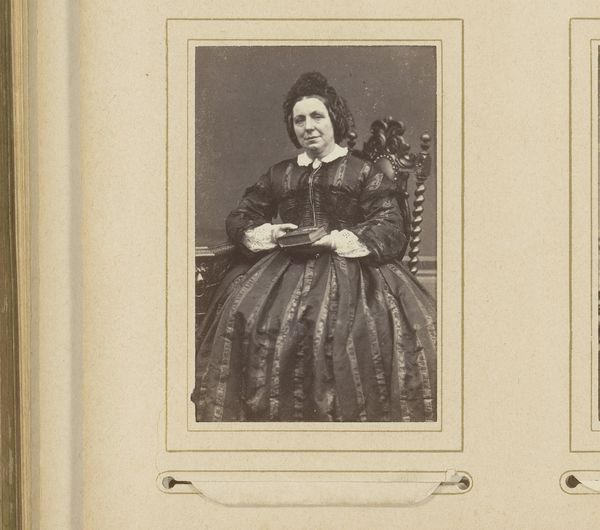 Editor: Here we have "Portret van een vrouw met boek," an albumen print dating from 1855 to 1880, attributed to Jacob Cosman. She looks quite severe, doesn't she? Considering this photograph, what do you find particularly interesting from a historical point of view? Curator: The woman's severe look and her book point toward the burgeoning culture of female literacy and intellectualism in the 19th century, especially within the middle classes. However, portrait photography like this was still a deliberate performance. It solidified social standing through the newly accessible medium. Think about how she chooses to present herself - how does that influence our reading of her image? Editor: I see that she's holding the book almost as an accessory. Is it possible this signals something about the social pressure for women to appear educated, perhaps more than genuine scholarly interest? Curator: Precisely. The photograph exists within the complex dynamic between the societal expectation for women to be accomplished, and the continued limitations placed on their access to genuine intellectual pursuits. Her very stern visage can even be understood as a defiance of that social expectation. But also consider where it was displayed. This was a *carte de visite*, small enough to be pasted into an album, a public demonstration of connections and societal position. Editor: So the portrait becomes more than just an image of a woman; it's an artifact of social and cultural expectations of the era? Curator: Exactly. It encapsulates the push and pull of progress and restriction within 19th-century society, a carefully curated display of respectability and implied intellectualism intended for public consumption. Editor: This really does offer a glimpse into the complex lives of women at the time, more than I initially thought. Thank you! Curator: Indeed, considering photography's public role in disseminating imagery really illuminates what's hidden in plain sight.