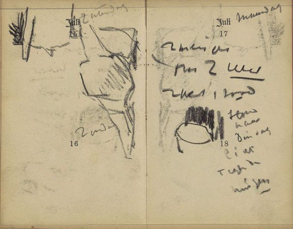 This page of a sketchbook, by George Hendrik Breitner, is made up of graphite on paper. These are very traditional art materials, but the manner of their use here is unusual. The marks are fleeting, almost like shorthand. Quick notes, impressions jotted down, addresses scribbled, with thumbnail sketches of figures and street scenes. The texture of the paper is visible, and its absorbent surface interacts with the graphite. The artist uses these effects to imbue the image with a sense of dynamism and immediacy. The drawing seems to exist in a space between intention and accident. It provides insight into the working process of an artist deeply engaged with documenting everyday life in the rapidly changing industrial and urban landscapes of the late 19th century. Ultimately, this work invites us to reconsider the value we place on finished artworks, and to appreciate the beauty and significance of the creative processes that underpin them.