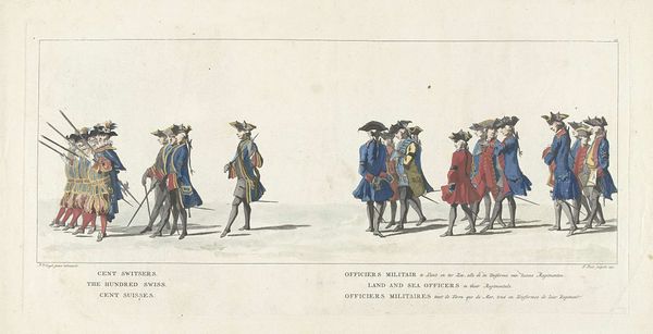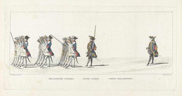 Editor: This print, titled "Lijkstatie van Willem IV, 1752, plaat 1," made in 1752 by Jan Punt, shows a regiment of dragoons on horseback. What strikes me is the almost dreamlike quality of the procession – they seem to be emerging from a mist. What do you see in this piece? Curator: This work really speaks to how we memorialize power. The repetition of figures, the almost identical uniforms…it creates an impression not just of military might, but of an institution that continues beyond any one individual. Notice, for instance, how even the horses appear like repeated symbols, almost spectral. What does that repetition evoke for you? Editor: It makes them seem less like individual soldiers and more like representations of something larger – like, as you said, the institution of the monarchy itself. Is that amplified by the solitary horse draped in black to the right of the print? Curator: Precisely. That lone figure, burdened by the drapery, laden with symbolism, contrasts starkly with the procession. It isolates death, marking it as a passage not just for Willem IV but for the entire order he represented. What emotional chord does that solitary figure strike in you? Editor: A feeling of finality. While the others are uniform, moving, and forward-facing, that single horse seems weighted by grief, alone. It definitely anchors the piece with an undeniable air of loss. I hadn't considered the implications of the figures as symbols instead of men at all. Curator: Indeed. The print reminds us that images can function as powerful cultural memories, subtly shaping our understanding of history and leadership.