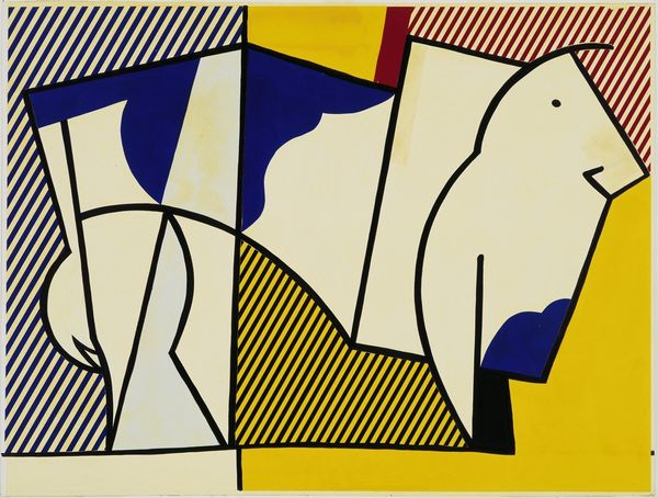 This is the center panel of Roy Lichtenstein's 'Cow Triptych', a screenprint made in 1982. Here, Lichtenstein reduces the familiar image of a cow into fragmented geometric forms. The cow, a symbol of fertility and nourishment throughout history, is broken down into its most basic visual components. This act echoes the ancient artistic impulse to abstract and simplify nature, reminiscent of cave paintings where animals were represented with bold, economical lines. The reduction to essential forms can also be seen in ancient Mycenaean art. The visual transformation of something as universally recognizable as a cow invites us to consider how we perceive and categorize the world around us. It's as if Lichtenstein is peeling back layers of cultural associations, stripping the cow of its sentimental value. This echoes our modern alienation from nature, a psychological separation reflected in the deconstruction of a classical, pastoral symbol. Lichtenstein captures an emotional tension between recognition and abstraction that engages us on a deeper level.