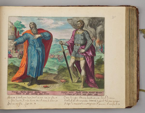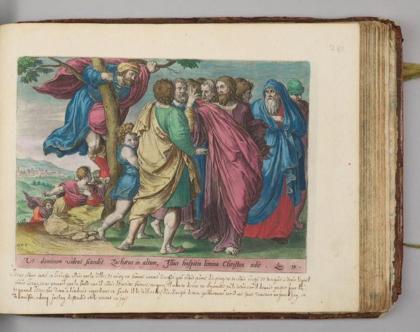 Curator: This engraving by Hans Collaert the Elder, titled "The Woman Who Was Cured of the Issue of Blood," presents a moment of apparent divine intervention. The plate measures roughly 8 by 10 inches. Editor: The colors strike me first, quite vivid and saturated for an engraving, lending a heightened, almost dreamlike quality to the biblical scene. Curator: The composition is quite deliberate. Notice the interplay between the central figures and the architectural elements—a fascinating study in contrasts. The lines are firm and suggest purpose. Editor: And what about the material aspect of its production? The plate engraving process itself, the labor involved, the socio-economic context of its creation and distribution - this really shapes the meaning. Curator: Perhaps. But the formal arrangement transcends the mere mechanics. The emotional tenor of the woman's upward gaze, the dramatic sweep of Christ's gesture, all speak to the power of faith. Editor: True, but even faith manifests through tangible acts, human labor, and material processes. It's all interwoven. Curator: Indeed, a potent reminder that meaning emerges through both form and context. Editor: Absolutely. A beautiful, complex artifact.